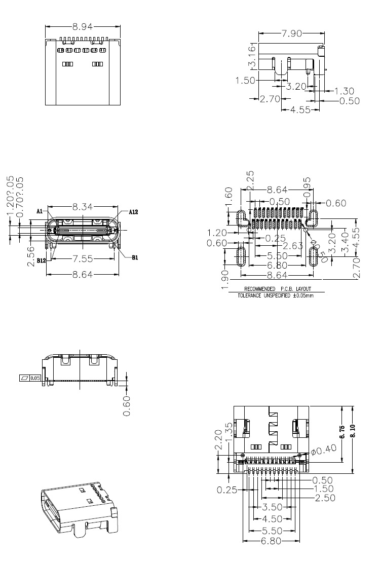 USB TYPE-C連接器臥式系列:單排6Pin、單排16Pin、單排16Pin墊高、前插后貼24Pin、雙排貼片24Pin。